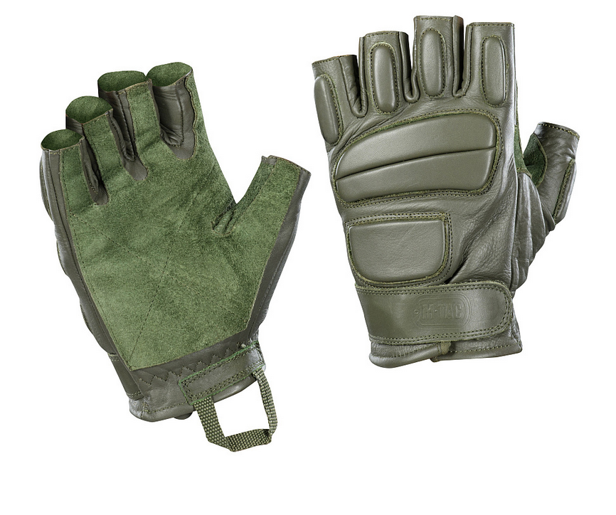 Рукавички без пальців Assault Tactical Mk.1 із вбудованим захистом марки M-TAC. Для виробництва рукавичок використовували натуральну шкіру. На руці є замшева вставка, яка запобігає ковзанню зброї, утримуючи її. Зовні на фалангах пальців, кисті та великого пальця є амортизуючі вставки. Кріплення на руці можливо завдяки клапану на липучці.
